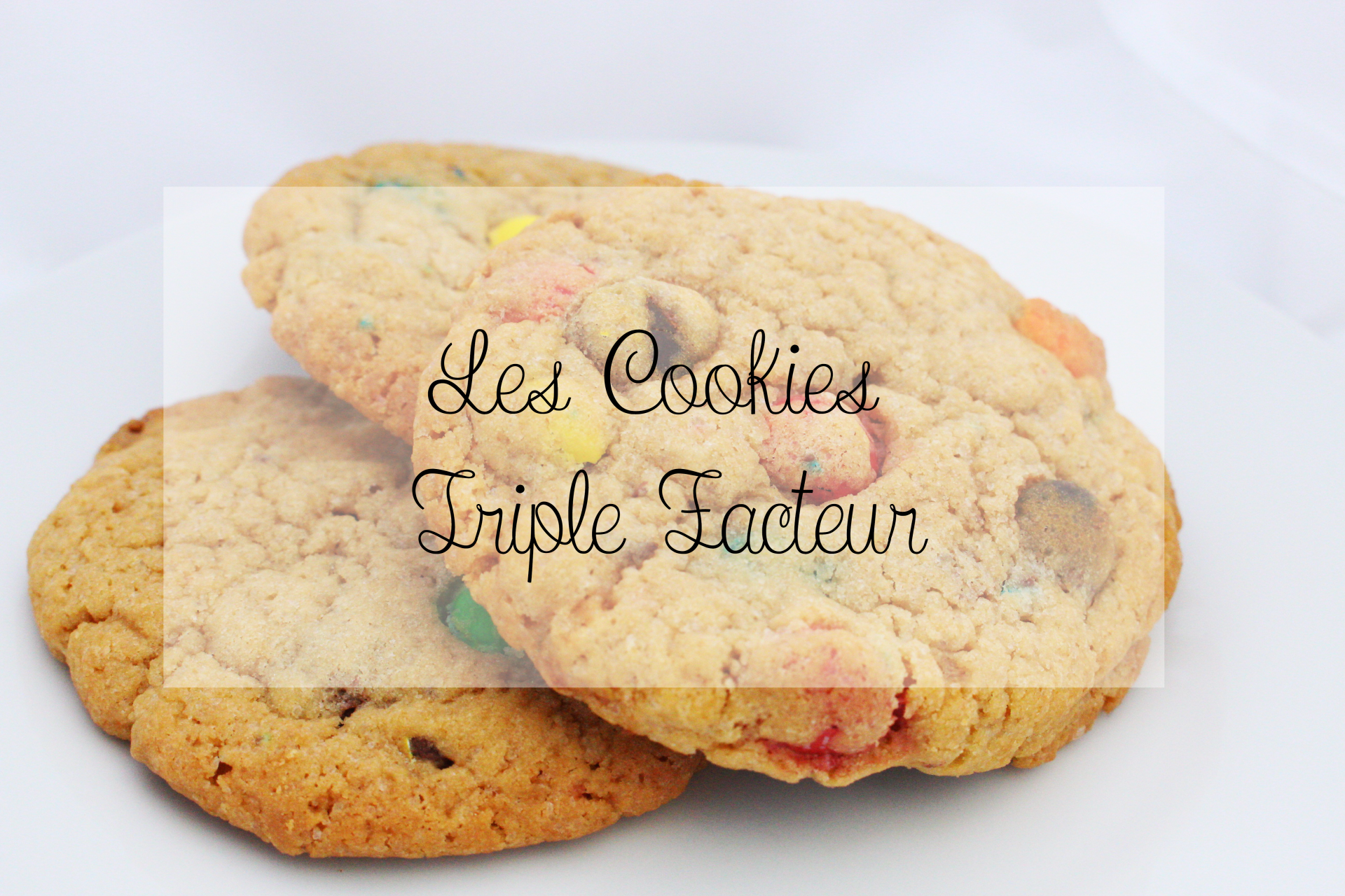Ces Cookies sont absoluments fous! Retrouvez des cookies parfaitement moelleux au centre, un peu croustillant à l'extérieur et plein de petites surprises pas comme les autres: m&ms, gros morceaux de chocolat blanc et des noix de macadamia grillées à merveille. Voici la recette pour nos Cookies Triple Facteur. On adore la couleur qu'ajoute les m&ms! Dégustez ces cookies entre grands ou petits, au café, au goûter, et même en déssert. Aux Etats-Unis, les cookies viennent traditionnellement avec un bon verre de lait frais. Vous allez fondre.